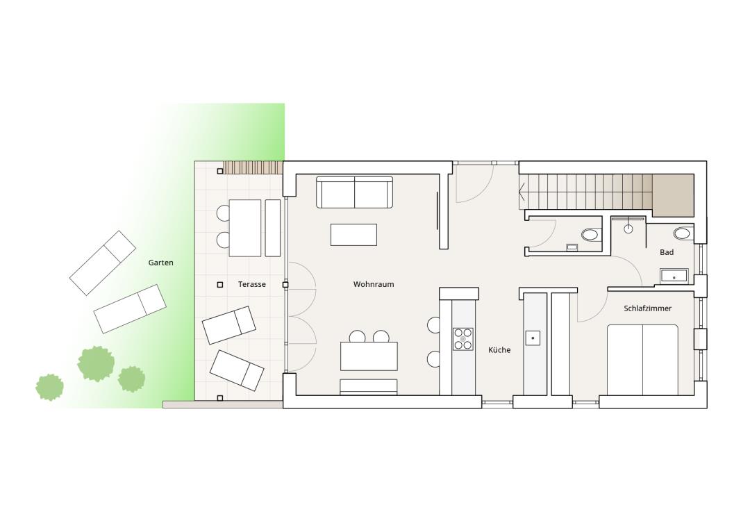 Im h9 TAL wohnen Sie auf 100 Quadratmetern mit Bergblick, eigenem Garten und gemütlichem Sauna- und Wohlfühlbereich. Die Wohnung TAL im Erdgeschoss hat ein großzügiges Wohn- und Esszimmer, hinter der Bar befindet sich eine offene Küche. Die Einrichtung ist hochwertig und größtenteils maßgeschreinert.