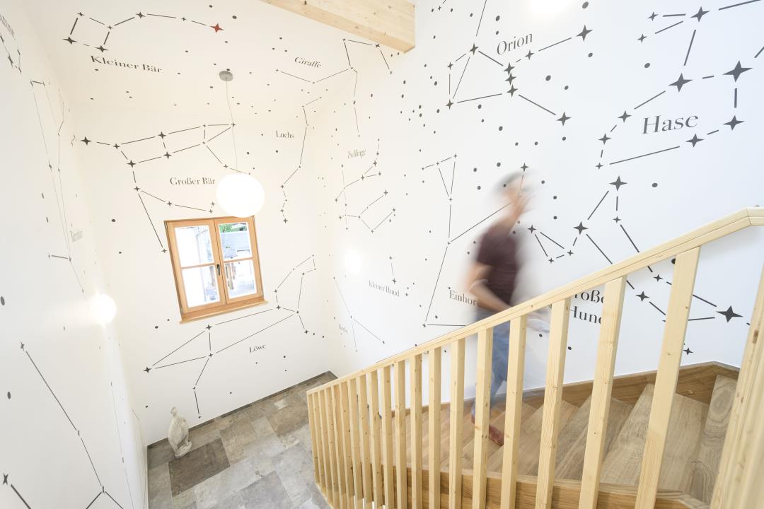 Im Sommer 2025 wurde das neu erbaute Ferienhaus „Sternenhimmel" im Dorfzentrum von Oberammergau eröffnet. Es verfügt auf 3 Etagen über 9 charmante Ferienwohnungen für 2-6 Personen, die individuelle Namen aus dem echten Sternenhimmel tragen. Sehenswert ist auch der „Sternenhimmel" im Treppenhaus. In diesem Haus haben Sie die Möglichkeit, gemeinsam mit Familie und Freunden zu verreisen und gleichzeitig Ihren privaten Freiraum zu genießen.